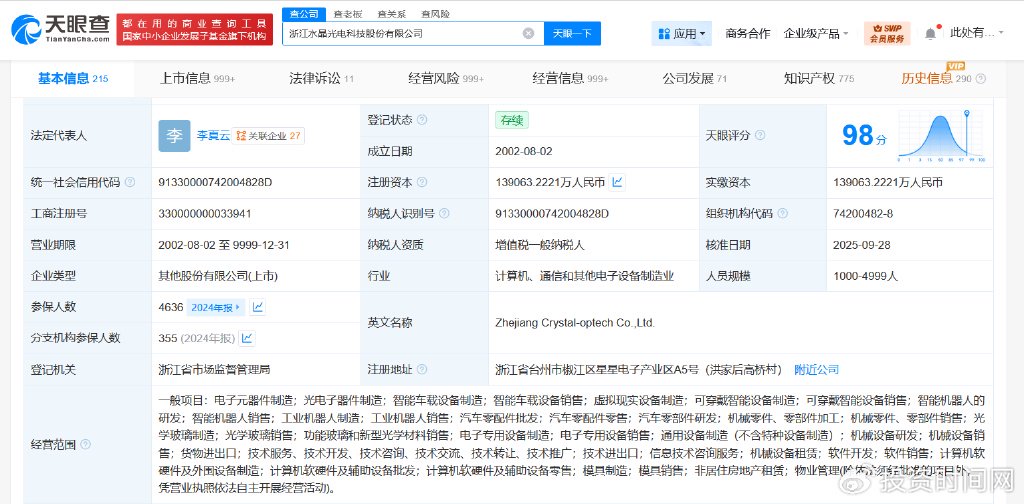 浙江水晶光电科技股份有限公司成立于2002年8月,注册资本约13.9亿人民币,经营范围含电子元器件制造、光电子器件制造、智能车载设备制造、智能车载设备销售、虚拟现实设备制造、可穿戴智能设备制造、智能机器人的研发、智能机器人销售等。