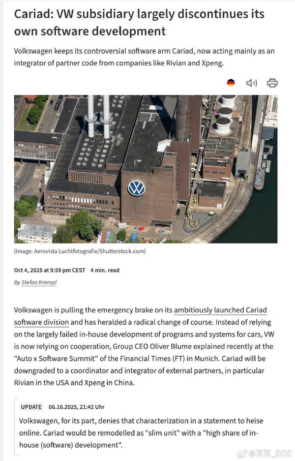 [CNMO科技消息]近日,据外媒报道,全球汽车巨头大众集团正计划彻底放弃其软件自研路线,将其旗下软件子公司Cariad的角色从核心“开发者”降级为小鹏汽车与Rivian的“合作伙伴协调者”。