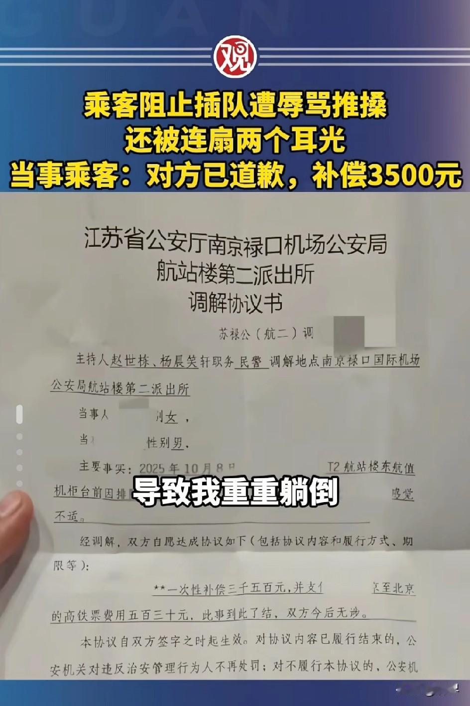 两个耳光就值3500? 被打男子也真不值得同情,没骨气! 正确处理应是:第一行政立案,第二伤情鉴定,第三再谈赔偿,绝对不能让3500就解决了问题。 要我说,赔偿是理所当然的,但是法律惩治同样也不能少,必须让他们被拘留,才能长记性。 我不是嘴毒,也不刻意针对,给大家还原一下事情的经过,大家就知道他们有多坏、多恶心、多气人了! 事情是这样的,10月8日的南京禄口机场,一男子戴先生正在排队值机,结果被一家四口无端插队到前面,这一家四口包括一对夫妻和一双父母。 戴先生见状,马上上前理论说“你们这样插队是不对的”。结果他的话音刚落便引起了对方不满,对方四个人像是打游戏团战一样,分工之明确,老头用行李箱重击他的腿部,老太婆则在旁边输出国粹,最可恨的是,对方女子出其不意,给他脸上连续来了两个大逼兜,一下就把他扇坐地上了,其老公则在旁边声援。 说实话,这场景,戴先生看着确实挺可怜的,不过怎么感觉还挺搞笑的呢?[捂脸] 最后,谁也没做成坐飞机,双方都被带到了派出所。对方见状开始怂了,男子则是低声下气的请求戴先生原谅,而女子听到要赔钱,一下便嚎啕大哭了起来,还辩称父亲有癌症脾气不好。 最后戴先生一心软,同意了派出所的调解,对方赔偿3500元,外加500元高铁费作为飞机延误的补偿。 本以为事情到这里就结束了,没想到还有大反转,双方一走出派出所大门,女子就又开始对着戴先生输出国粹。 男子一见状,好哇,马上掏出手机,把刚刚删除的视频,从回收站里又给恢复了,并配上“娶到这样的老婆,以后有你好受的了”文字后,一键发送到了网上。而对方怎么也没想到,这删除的视频居然还能恢复[笑哭][笑哭] 随后,各大媒体纷纷关注到此事,全网也是替受害戴先生站队,指责对方行为恶劣。但大家更多的是替戴先生鸣不平,怎么两个大逼兜就值3500?吐槽戴先生缺少骨气,要是换作自己,那就是3万5的事了! 要我说,有些人就是被惯出来的,一而再再而三的对他包容原谅,换来的只会是得寸进尺,永远不会认识错误。 对此,大家怎么看?欢迎评论区留言讨论。