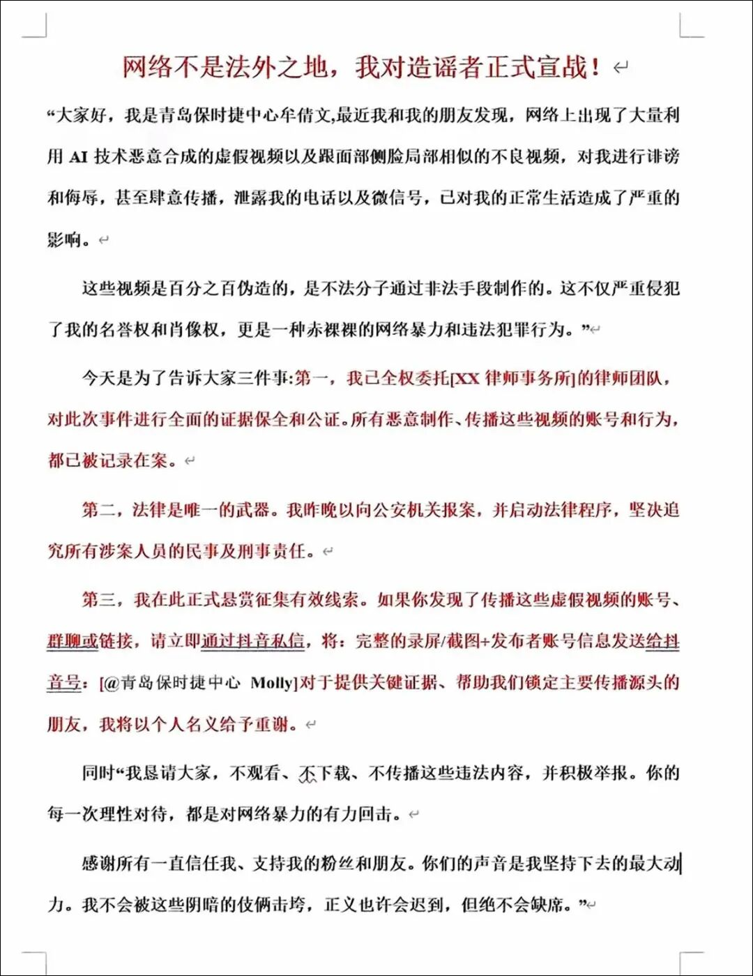文中称,这些视频是百分之百伪造的,由不法分子通过非法手段制作。她已委托律师团队,对此次事件进行证据保全和公证。