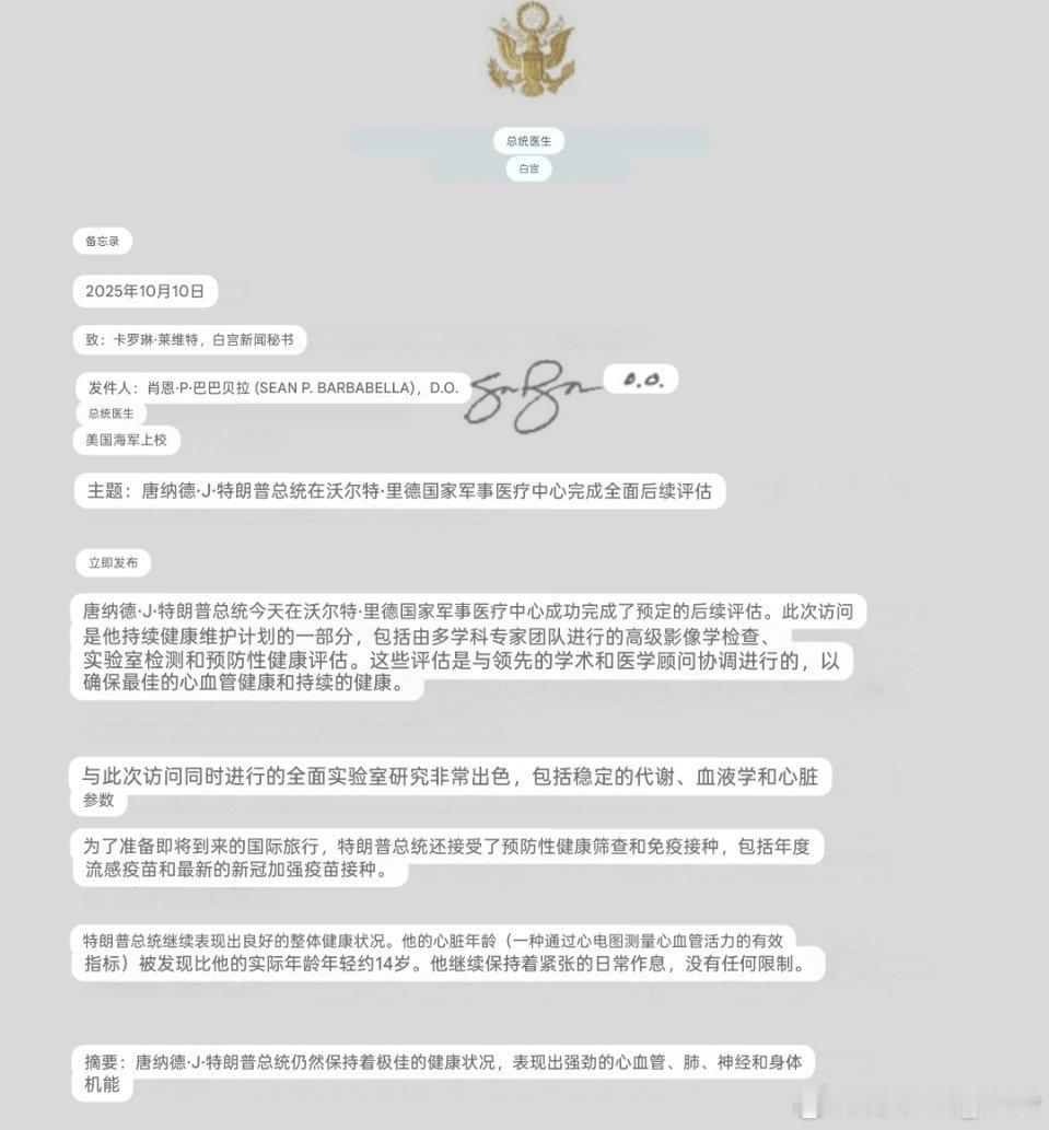 白宫医生公布特朗普体检报告。报告称他的“健康状况极佳”,已接种流感疫苗和新冠加强