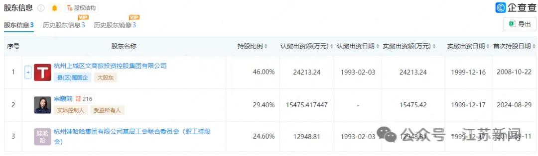 此次也是宗馥莉第二次辞职,而辞职获得批准后,由于流程问题,目前天眼查仍然显示宗馥莉为娃哈哈集团法定代表人。杭州娃哈哈集团有限公司成立于1993年2月,注册资本约5.26亿元人民币,由杭州上城区文商旅投资控股集团有限公司、宗馥莉、杭州娃哈哈集团有限公司基层工会联合委员会(职工持股会)共同持股,分别持股46%、29.4%、24.6%,宗馥莉仍为第二大股东。