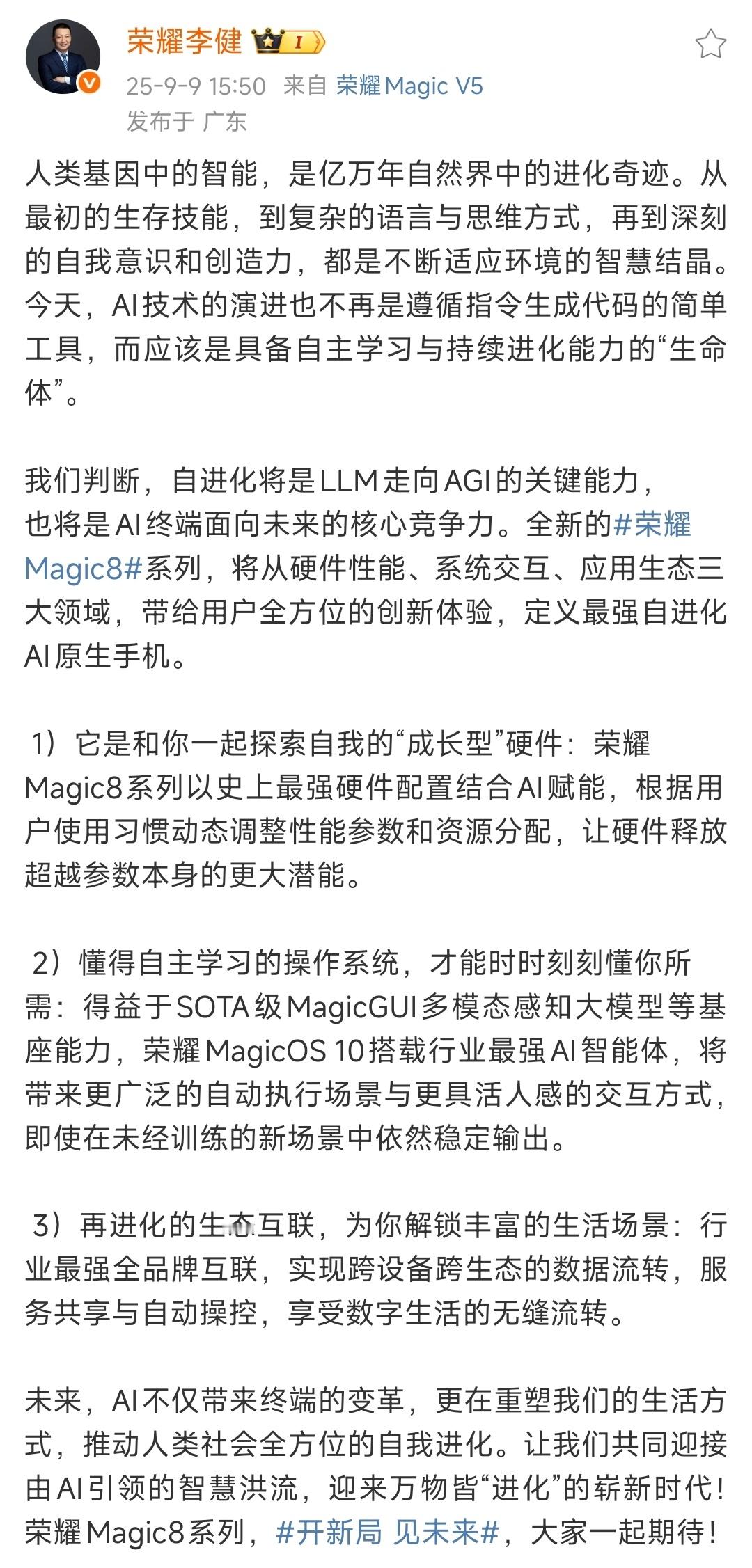 荣耀谢霆锋20年时间,谢霆锋用 “Evolution” 巡演证明自己始终在音乐路上进化;而荣耀Magic8系列则用实打实的技术,诠释什么是 “自进化AI原生手机”。从李健总提出的阿尔法战略,到Magic8系列的落地,荣耀把AI做成了核心竞争力:实体物理AI键带来便捷交互,3000+场景自动执行覆盖工作生活,比如假期处理工作时自动总结邮件,完全解放双手,就像谢霆锋在演唱会上可能会解锁新的表演形式,Magic8系列的AI也将持续进化,不断解锁智慧新能力。一起见证这场双向奔赴如何把 “进化” 做到极致!