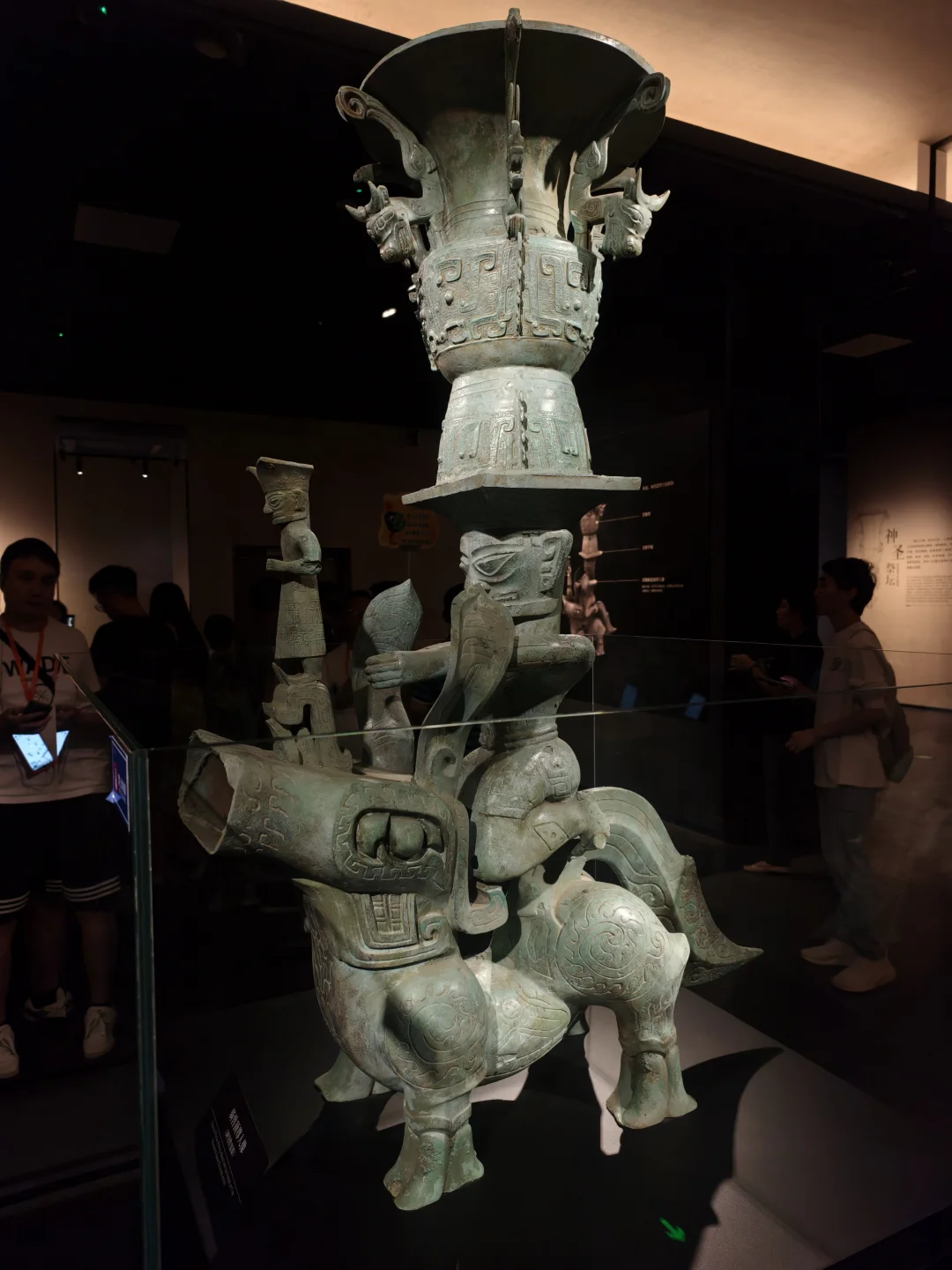 人像站在神兽背上,头顶还有神坛,一层叠一层