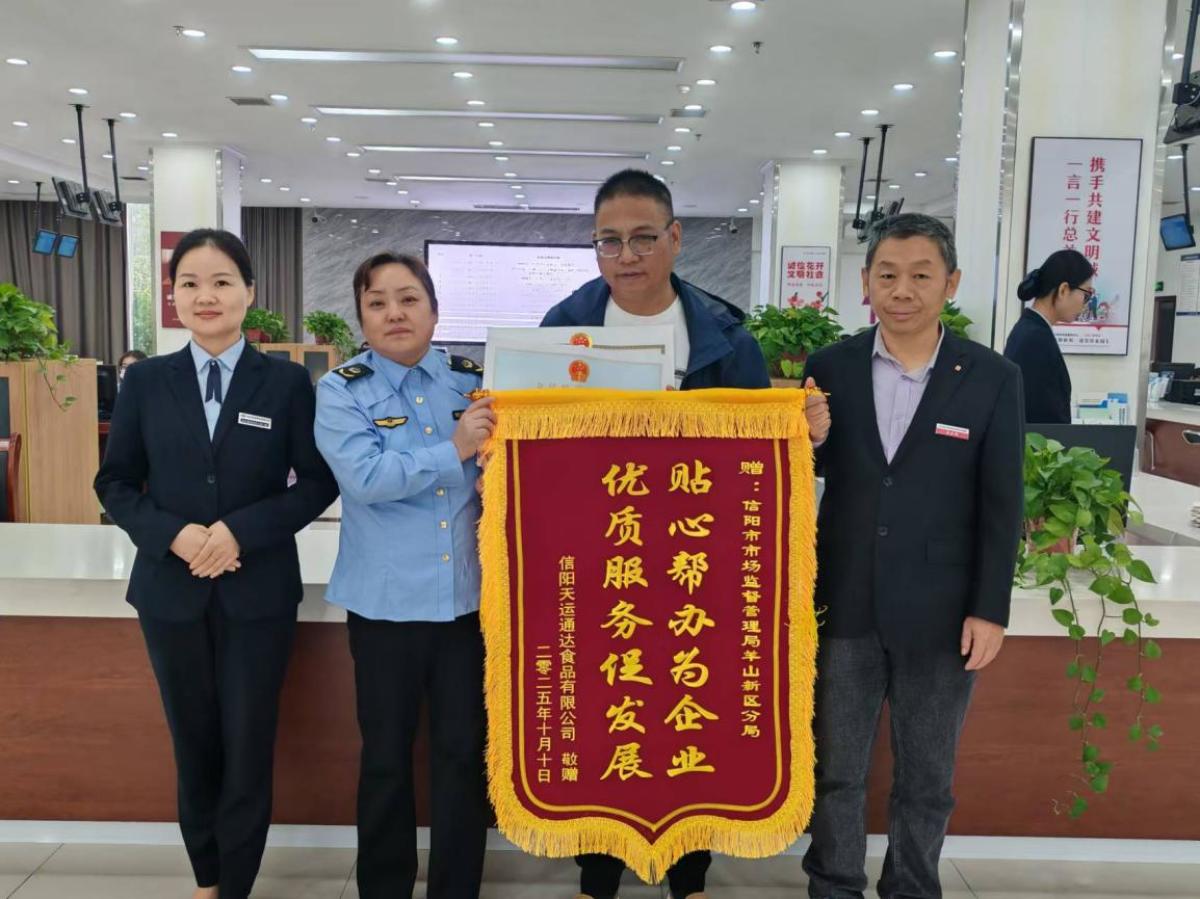 近日,信阳天运通达食品有限公司的负责人李先生专程来到信阳市羊山新区政务服务中心,将一面写有“贴心帮办为企业,优质服务促发展”的锦旗赠予信阳市市场监管局羊山新区分局窗口,并高度赞誉了工作人员热情、高效、便捷的优质服务模式。