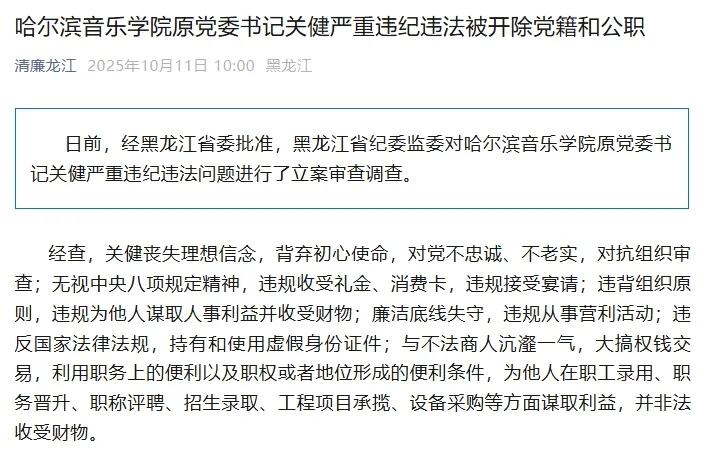 “影帝”的假证件,终究穿帮了!谁能想到,一位高校党委书记,手里攥着假身份证,在商人和权力圈里“反复横跳”,愣是把象牙塔演成了“权钱交易剧场” 今年7月,哈尔滨音乐学院党委书记关健主动投案,震动黑龙江教育圈。三个月后的通报来了:双开!这位曾经执掌全省唯一公办艺术本科院校的“一把手”,用假证件给自己加戏,结果戏台塌了 假证件在他手里成了“万能钥匙”: · 遮掩利益链:真的身份治学,假的身份搞钱,学术殿堂成了生意场; · 规避监管:用假名开户、签合同,自以为能瞒天过海; · 混圈捞人脉:假身份混商界,真权力当筹码,高校声誉沦为交易货币 可演技再好,也逃不过纪律的“高清镜头”。通报里一句“销毁、转移证据”,简直现实版《潜伏》演砸了 高校不是江湖,讲台更非戏台! 当假证件成了“一把手”的标配,学术尊严何在?教育底线何存?这事儿给所有高校敲响警钟: · 权力脱缰,象牙塔也会长蛀虫; · 监管缺位,假证件就能开“后门”; · 学术圣地,容不得“双面人”飙戏! 身份证能造假,办学初心不能造假;权力能换钱,但换不回干干净净的教鞭!假证件 高校 通报