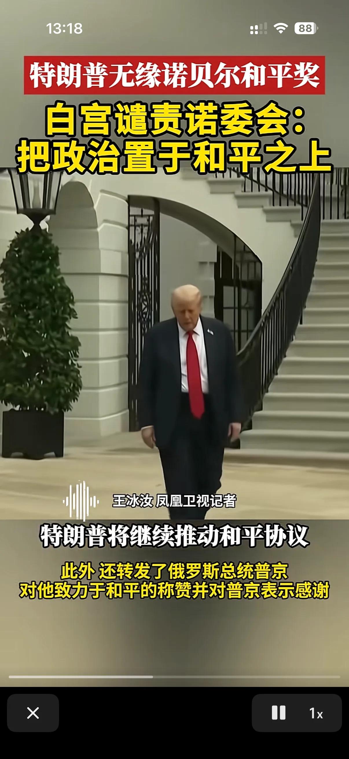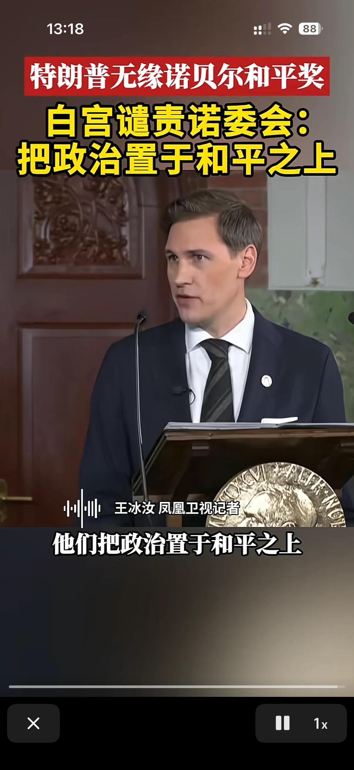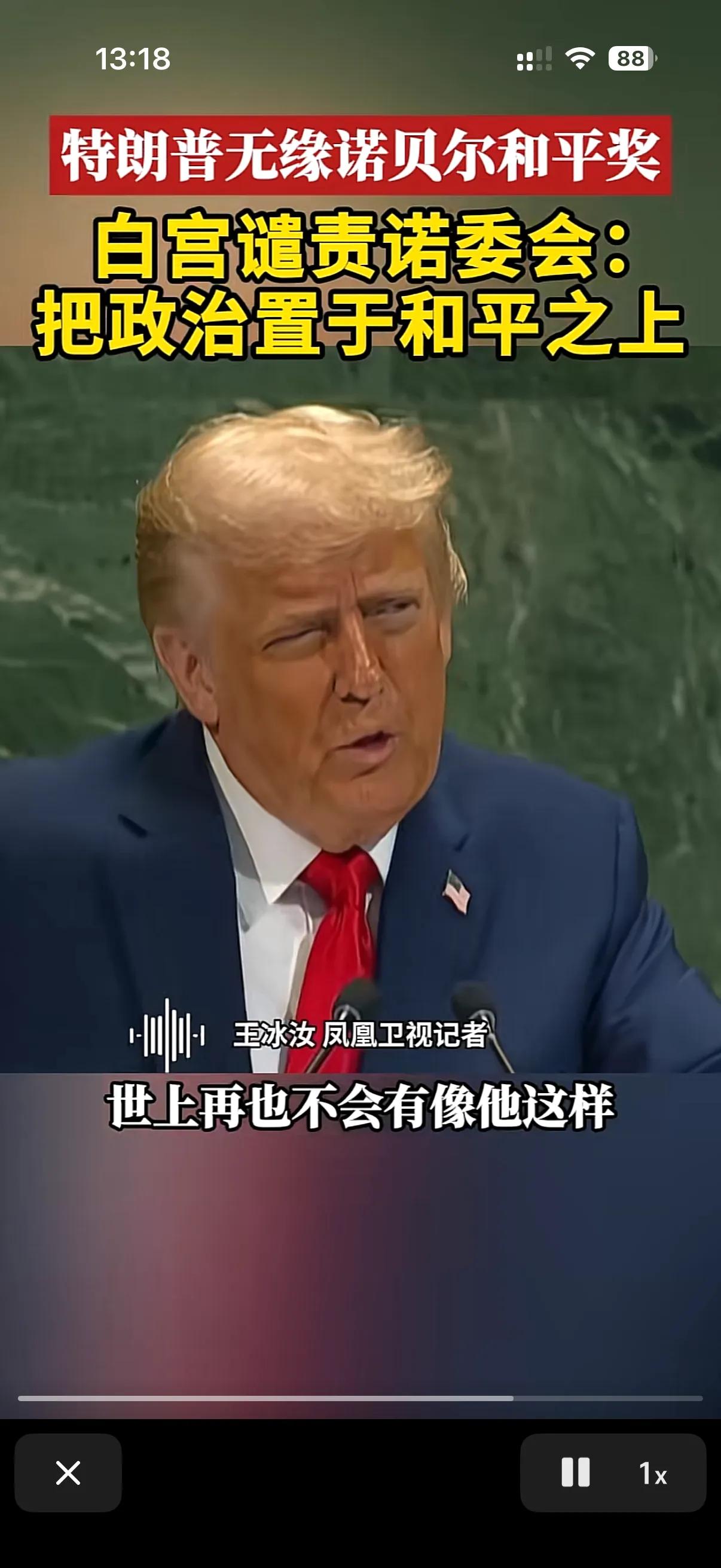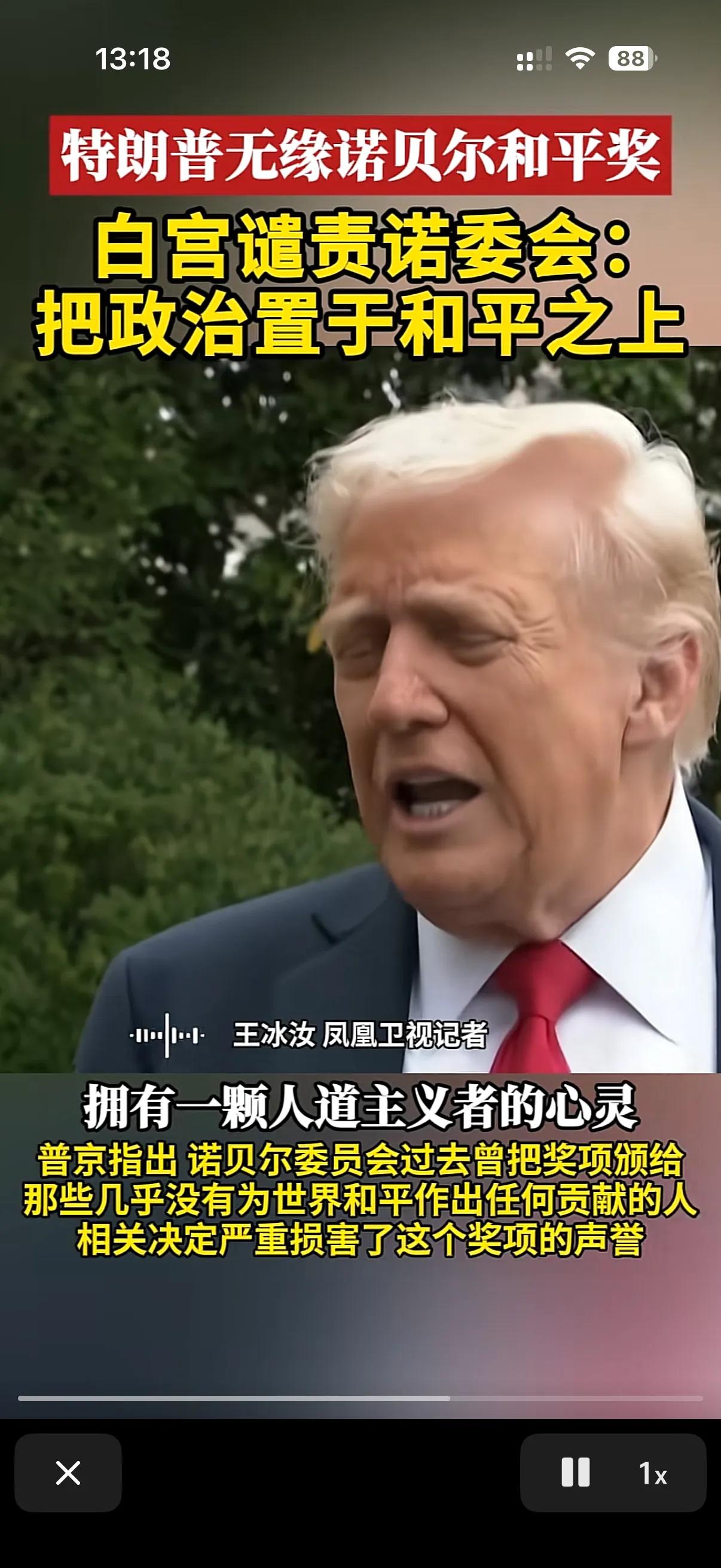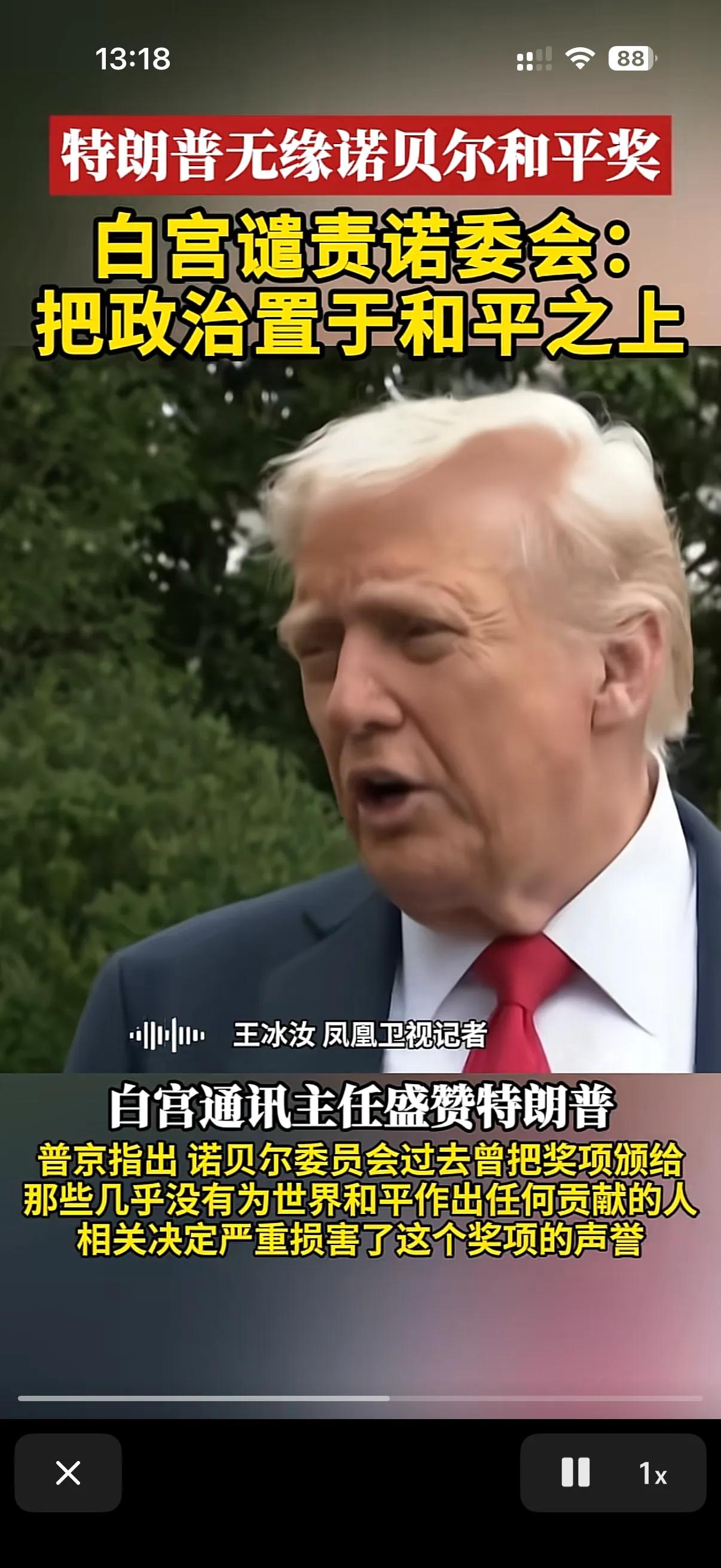 特朗普这次没有获得诺贝尔和平奖,罕见的特朗普自己没说什么,那是因为自有人替特朗普鸣不平! 美国白宫特意发表了一个新闻发布会,称特朗普这次没有得到诺贝尔和平奖,就是遭受了莫大的不公! 是典型的和平为政治服务,相比于特朗普今年上台以来的接连调节了八次交战冲突,远的有巴以冲突,近的有俄乌冲突,尤其是最近的加沙停火,就是在特朗普的调节下达成的,而这次诺贝尔评选委员会将诺贝尔和平奖给了别人,没有给特朗普,完全是从政治角度去考虑的,并不是从谁给世界带来了更多的和平,诺贝尔和平奖是应该给能让世界得到更多的和平人手里,而不是从政治或者其他角度考虑! 不得不说,这次诺贝尔和平奖没给特朗普是真让特朗普领导的美国白宫破大防了!