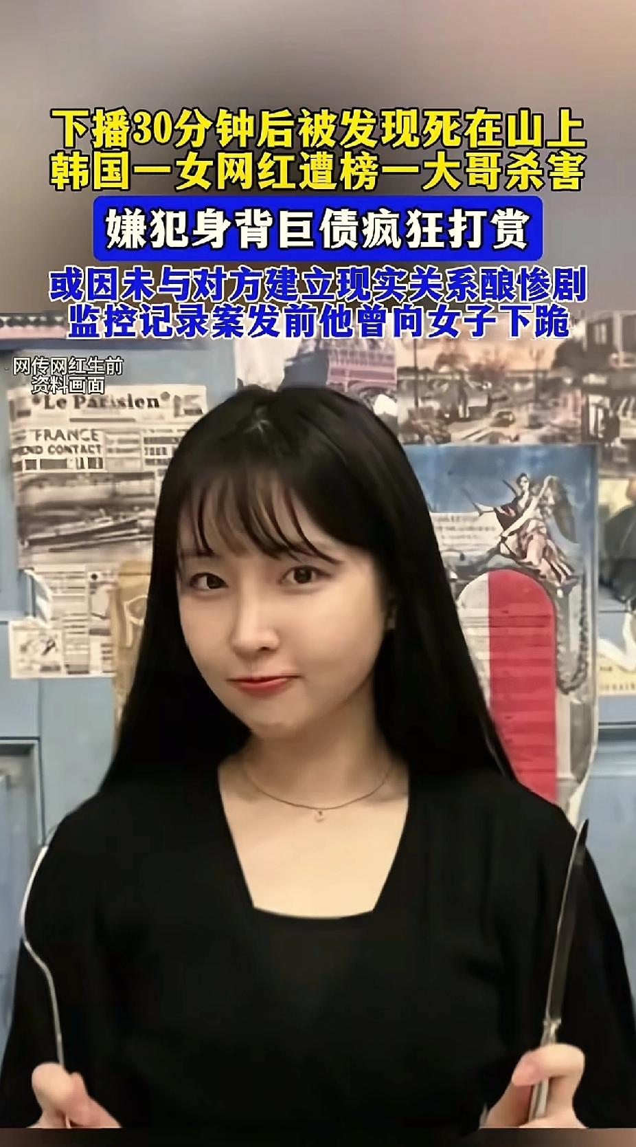 韩国最近出了个事儿,看完直让人后背发凉——25岁的漂亮女主播刚下播半小时,就被人打死扔山沟里了,浑身是伤。 凶手不是别人,正是直播间里天天给她刷火箭、冲榜的“56级贵族”崔大叔。五十多岁的人,装成富豪,张口就说“我给你投广告、拉资源”,实际上房子早被拍卖,卡债一堆,全靠借钱撑面子。为了保住“榜一大哥”的名头,一年多砸进去一亿韩元(差不多人民币五十万),眼睛都不眨。 案发前一天,监控清清楚楚拍到崔大叔当着她的面直接跪下来,还不停磕头,没人知道他这是想把打赏的钱要回去,还是想逼着人家跟他处对象。 结果到了第二天晚上,他就把女主播骗到山里,下了死手。把尸体藏好后,他居然跟没事人一样回酒店睡觉了。 这事儿一曝光,网友也炸了,直言说现实中的榜一大哥,没几个是真正的富豪。真正的富豪是不屑于去干打赏主播这种事的,网友还说了,真的不要随便拿别人的钱 ,屏幕后面的大哥谁知道是人是👻,天上掉的馅饼可也能是一把刀。所以还是踏踏实实挣钱吧。