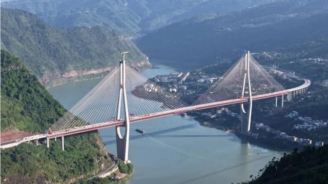 10月10日,记者来到施工现场看到,全长1867米的特大桥如钢铁“长虹”从金沙江面飞跨而过,连通滇川两省;分列在四川岸、云南岸的两座主桥塔如巨柱一般直指云霄。“我们这座大桥的特点是‘两最’。”项目总工夏明强介绍:第一个“最”是大桥云南岸的主塔高297.51米,是川滇两省已建成或在建斜拉桥中的最高塔;第二个“最”是大桥主跨达680米,在四川省内同类型桥梁中跨度最大。