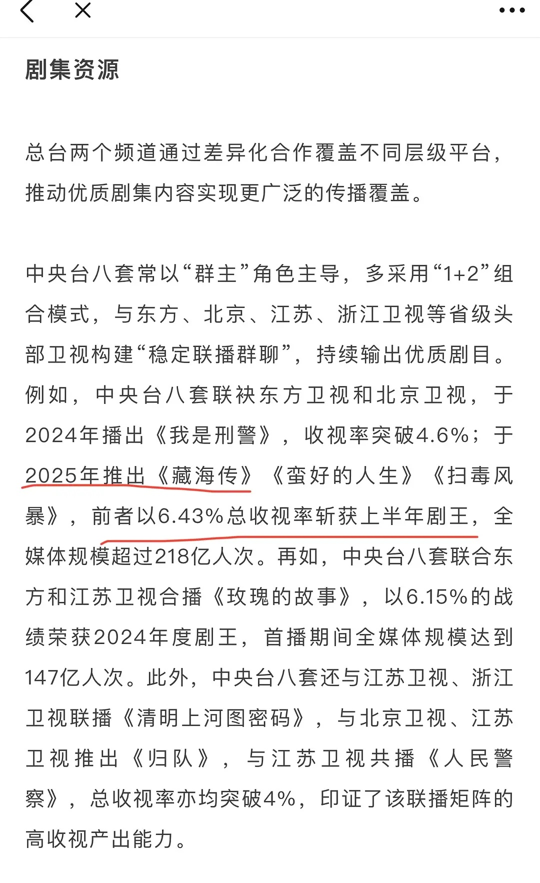爱吹csm的有福了,csm刚官方发布:25年《藏海传》以6.43%总收视率获上半年剧王,全媒体规模超218亿人次。每天都有官方数据帮着吹。