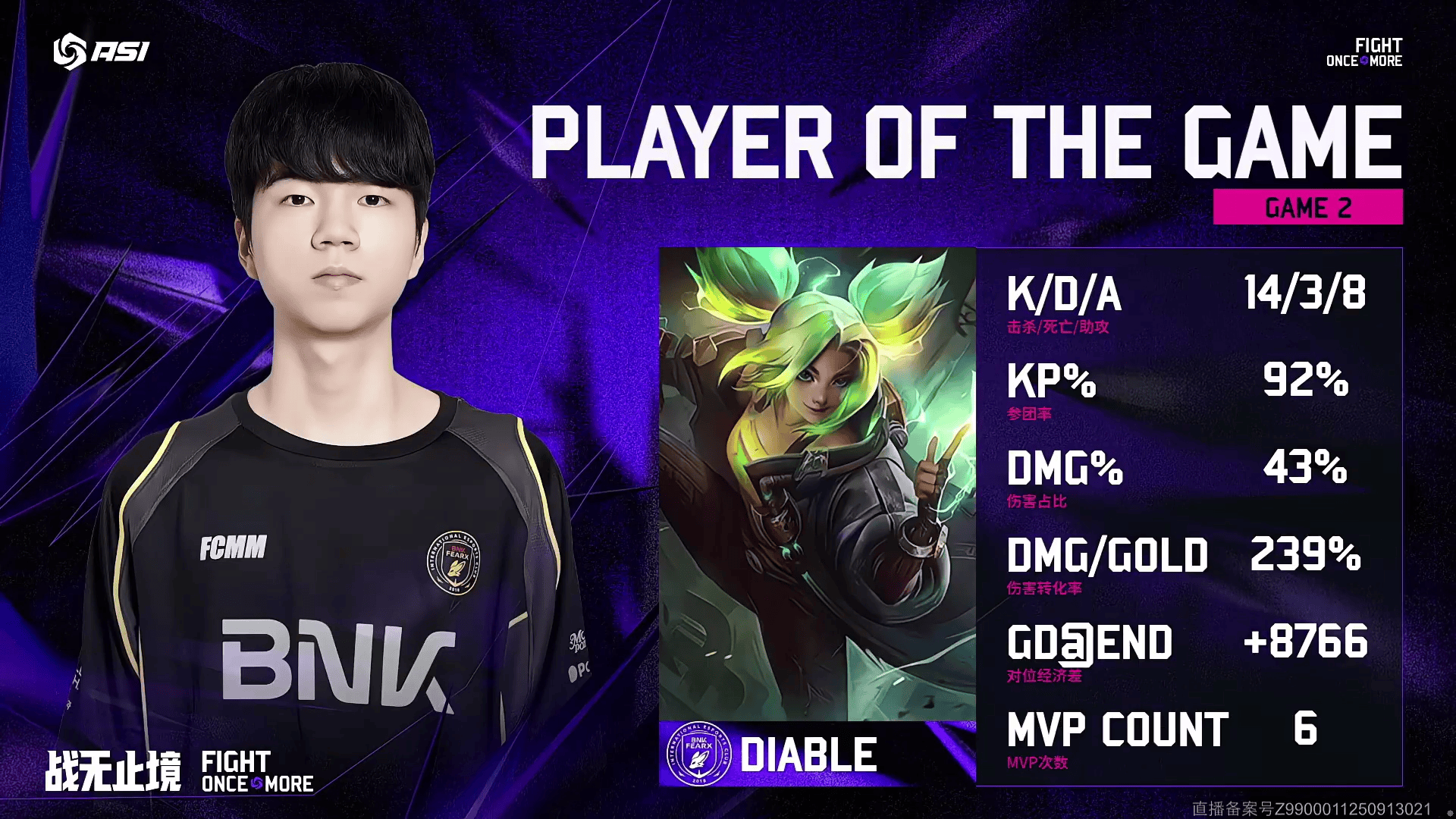 Diable泽丽砍下14/3/8的战绩,拿下BFX对阵WBG次局MVP