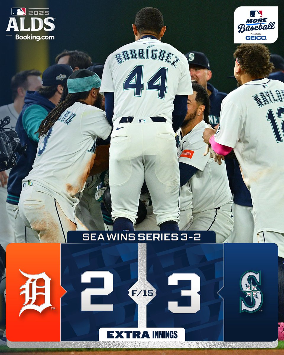 MLB官方X账号发布推特报道。西雅图水手队在季后赛历史上最漫长的一场定胜负比赛中获胜!水手队锁定美联冠军赛席位!(MLBxGEICO)