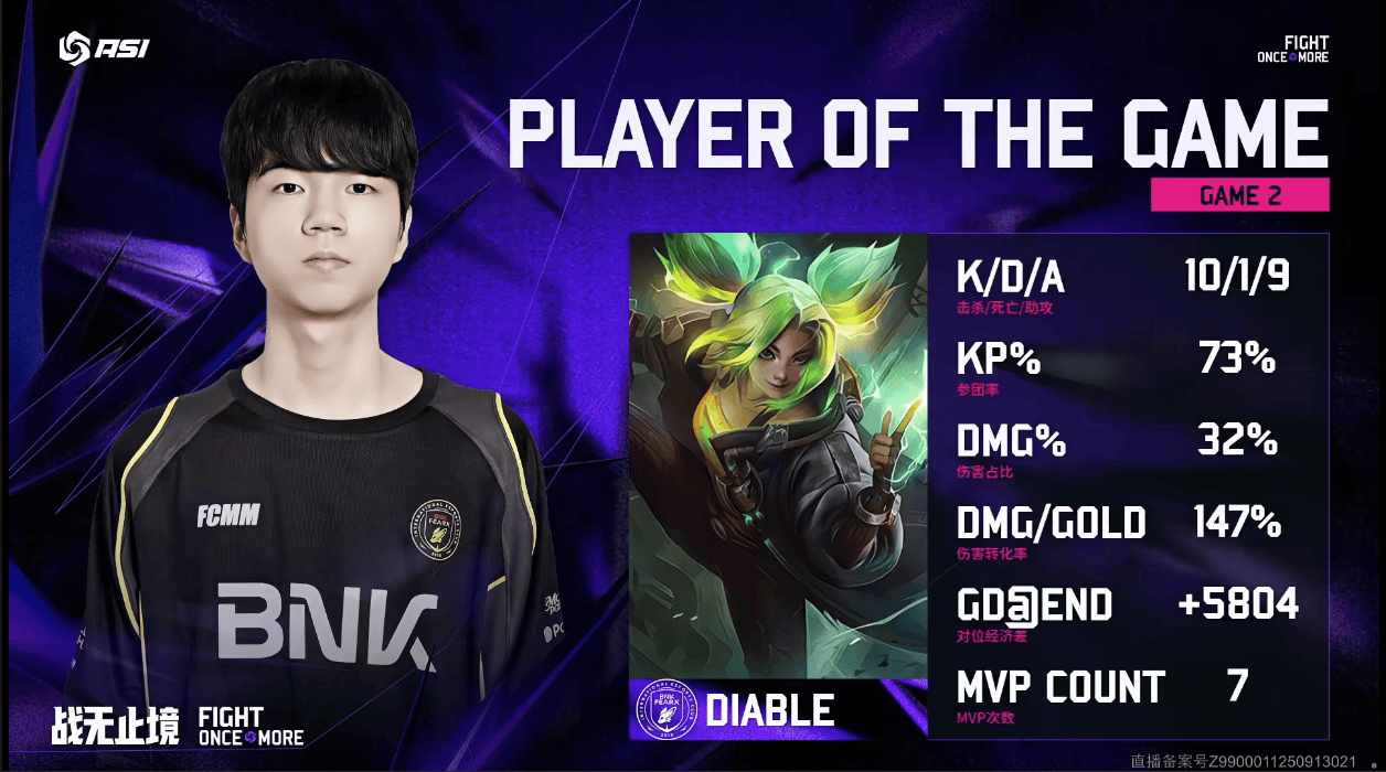 Diable泽丽打出10/1/9战绩,斩获BFX对阵NS第二局MVP