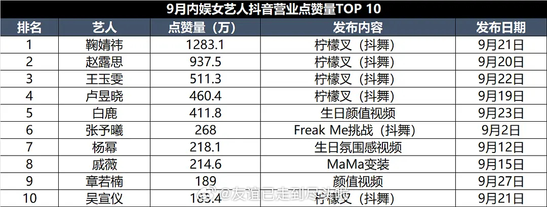 1. 女艺人高赞内容基本都是抖舞和变装。本月热门柠檬叉赛道有:鞠婧祎、赵露思、王玉雯、卢昱晓、吴宣仪。其他抖舞/变装:张予曦和戚薇