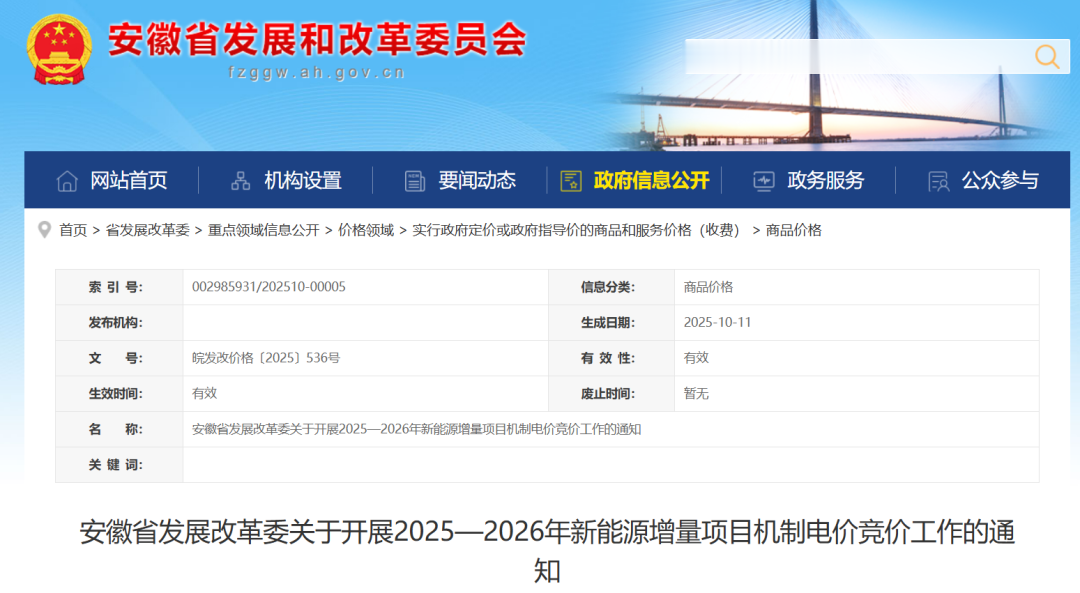 风芒能源获悉,10月11日,安徽省发展改革委发布《关于开展2025—2026年新能源增量项目机制电价竞价工作的通知》。