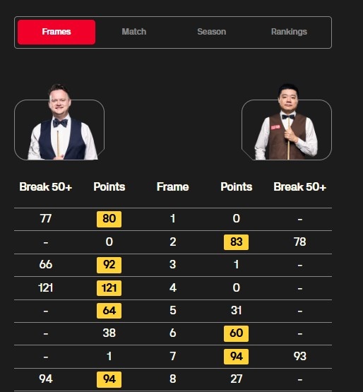 首局墨菲打出单杆77分获胜,第二局丁俊晖打出单杆78分将比分扳平,随后墨菲连胜三局,紧接着丁俊晖连扳两局,第八局墨菲打出单杆94分获胜。