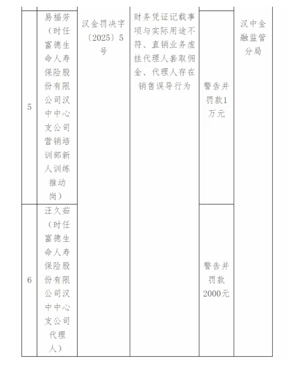 【富德生命人寿汉中中心支公司多项违规,公司及相关责任人被罚23.2万】 富德生命人寿保险股份有限公司汉中中心支公司处罚情况 汉金罚决字〔2025〕5号显示,富德生命人寿保险股份有限公司汉中中心支公司存在多项违规行为。具体包括财务凭证记载事项与实际用途不符、将直销业务虚挂代理人以套取佣金,以及部分代理人存在销售误导行为。鉴于此,汉中金融监管分局对该公司作出警告并处以21万元罚款。 此外,相关责任人也受到了相应处罚: 1.刘 佳,时任富德生命人寿保险股份有限公司汉中中心支公司副总经理(主持工作),因其在管理职责上的关联,被予以警告,并罚款1万元。 2.易福芳,时任富德生命人寿保险股份有限公司汉中中心支公司营销培训部新人训练推动岗人员,鉴于其岗位与业务培训等工作相关,被给予警告处分,并处以1万元罚款。 3.汪久茹,时任富德生命人寿保险股份有限公司汉中中心支公司代理人,因其存在销售误导行为,被警告并罚款2000元。 该处罚决定由国家金融监督管理总局于2025年10月9日作出: