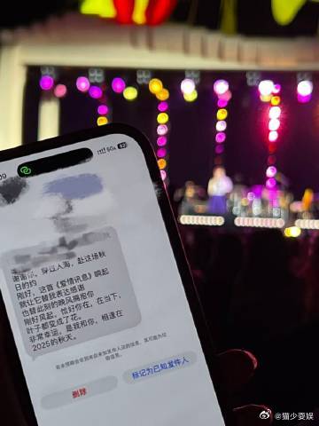 十月收到了郭静的爱情讯息谁懂啊!上海下班冲去见喜欢 n 年的郭静,听她唱《爱情讯息》时竟收到专属爱情讯息!风起时她在台上唱,你在台下笑,叶子都成了花,2025 秋的相逢也太幸运,建议所有演唱会按这标准卷! ​​​