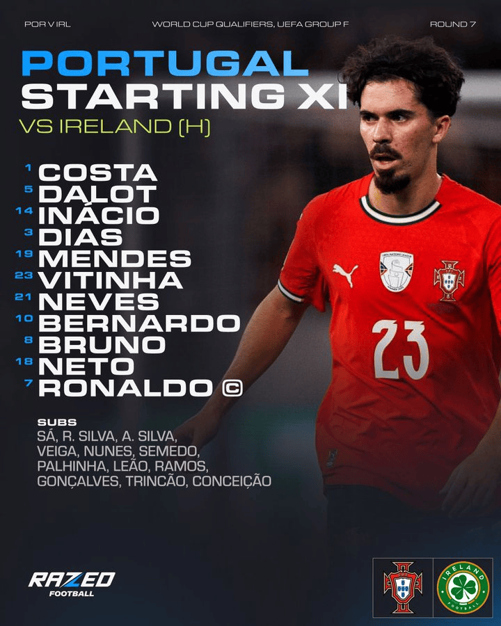 虎扑10月12日讯世欧预小组赛F组第三轮,葡萄牙主场迎战爱尔兰,赛前,双方公布了本场比赛首发名单。