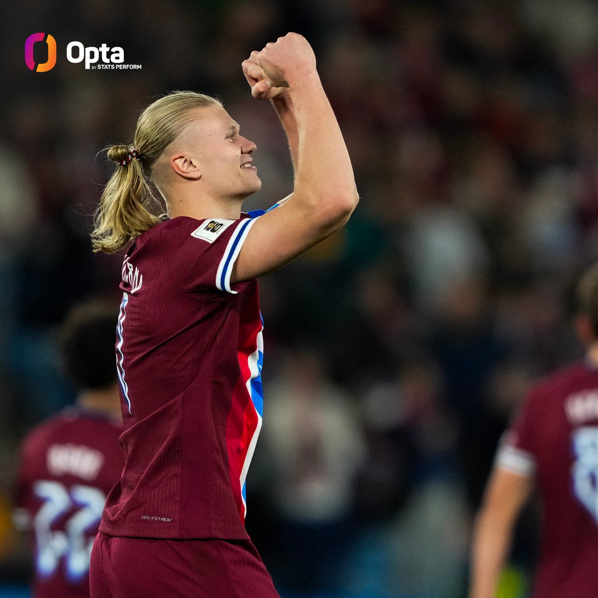Opta数据统计,自进入21世纪以来,挪威国家队共有11次球员单场打入至少3球——其中6次由哈兰德一人完成,其余所有挪威球员合计仅有5次。