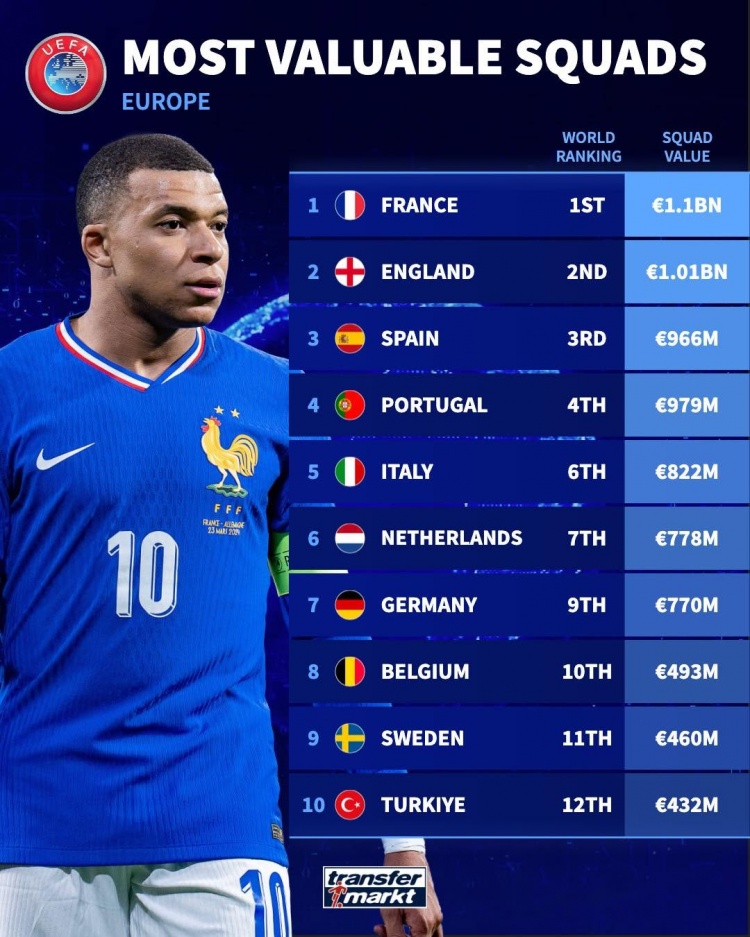 直播吧10月12日讯德国转会市场网近日更新欧洲国家队身价排名,法国队以11亿欧元总身价高居榜首,英格兰(10.1亿欧)与西班牙(9.66亿欧)分列二、三位↓