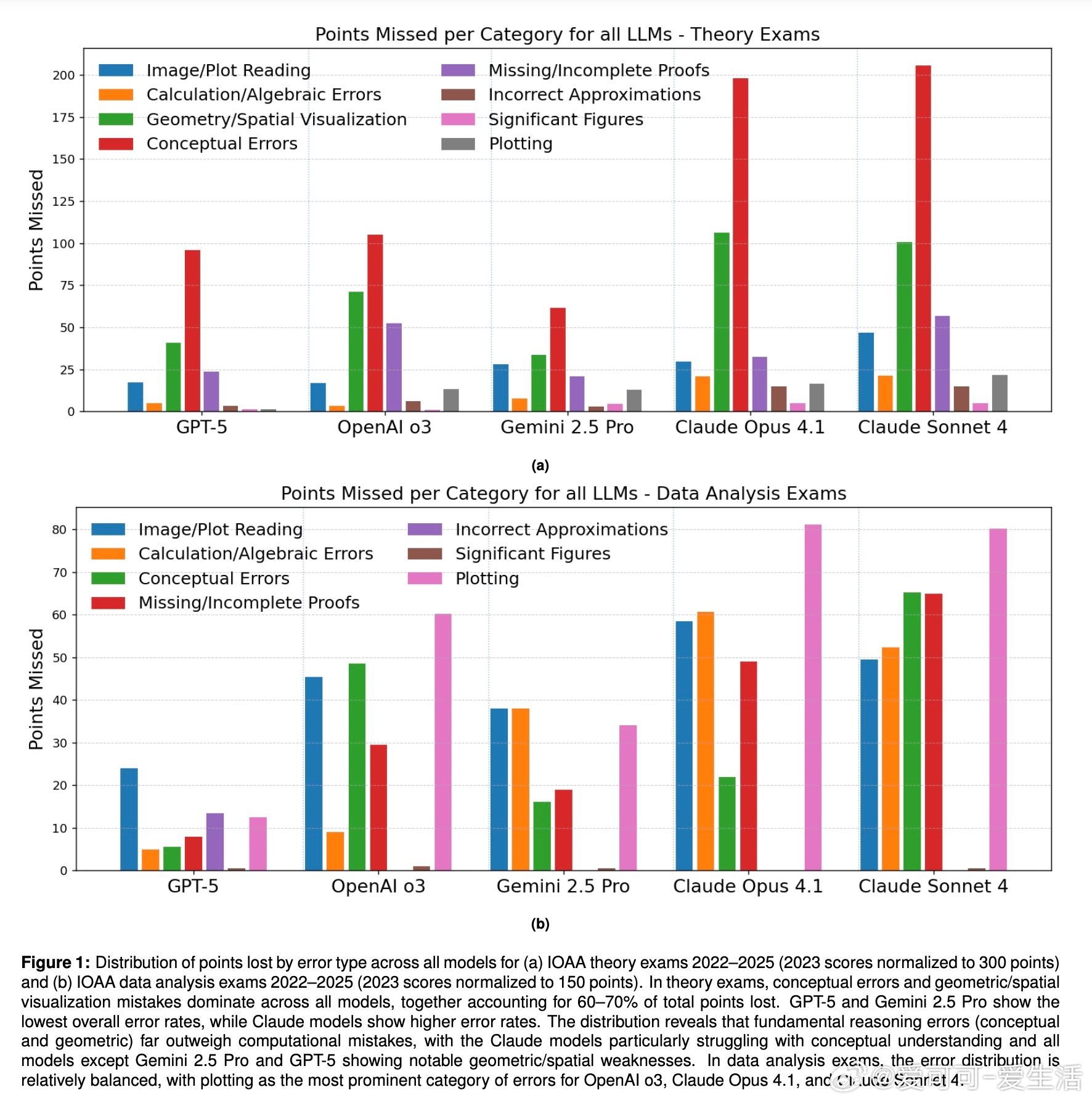 研究团队全面评测了五款顶尖LLM(包括GPT-5、Gemini 2.5 Pro等)在2022-2025年IOAA理论与数据分析考试中的表现。结果显示: