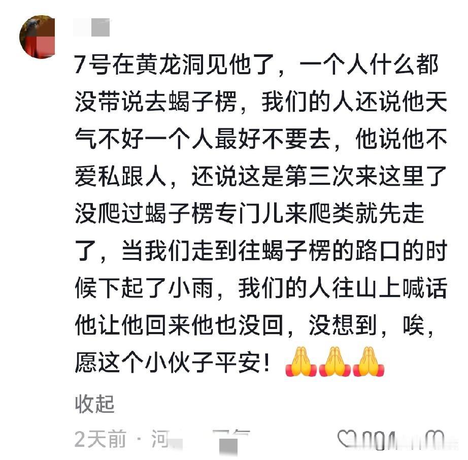 独自爬南太行山的男子的父亲说,他们就这么一个孩子,就算山上下刀子,他也得进去找儿子。 山里的温度很低,尤其是到了晚上,可能也就几度,父母都担心死了,几天几夜没合眼了。 都29岁了,也是个成年人了,怎么一点安全意识也没有呢。 我看评论区有个网友说,爬山的路上碰到一个人,和这个男子的特征很像,当时网友他们几个人,看到他一个人爬山时,还劝他不要一个人爬,小伙当时很自信,说这是第三次来这里了,他不愿和别人一块爬。他说想去蝎子愣,后来山里下小雨,网友们喊他下山,但小伙没有回应。 如果网友见到的人是这个小伙的话,可能他因为来过两次,太自信了,所以没带什么吃的和衣物,他可能想着一会儿下山的。 但是山里的天气瞬息万变,经常会有浓雾。雾来了,能见度可能也就三四米远,别说来过两次,就是山里的人家都可能迷路。 一定要对大自然有敬畏之心啊!