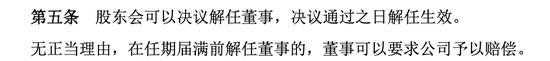 值得关注的是,办法第五条标注着:股东会可以决议解任董事,决议通过之日解任生效。无正当理由,在任期届满前解任董事的,董事可以要求公司予以赔偿。