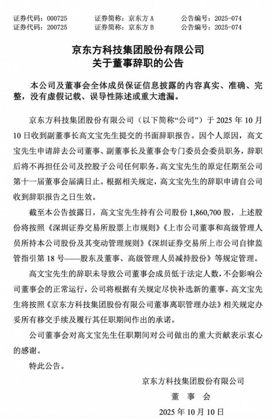 相关公告内容显示,京东方董事会于10月10日收到副董事长高文宝先生提交的书面辞职报告。因个人原因,高文宝先生申请辞去公司董事、副董事长及董事会专门委员会委员职务,辞职后将不再担任公司及控股子公司任何职务。