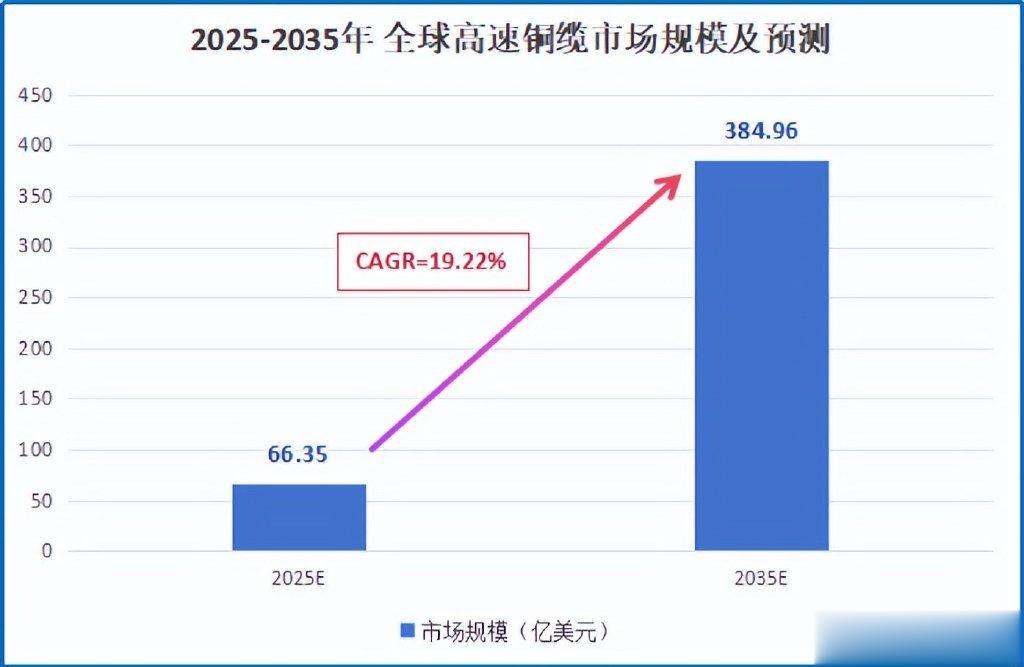 根据预测,2025-2035年,全球高速铜缆市场规模将由60多亿美元增长至近400亿美元,年复合增长率高达19.22%。