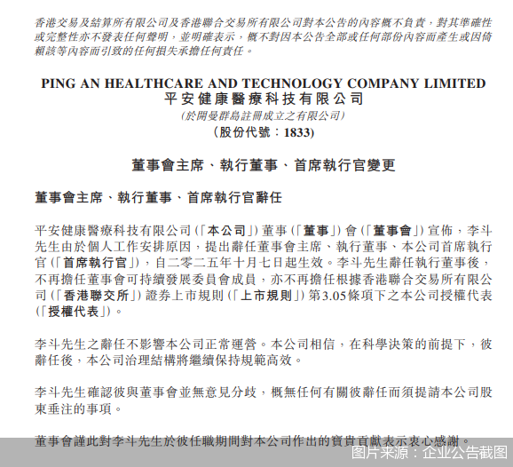 公告显示,平安好医生董事会主席、执行董事兼首席执行官李斗因“个人工作安排原因”辞去所有职务。这一决定颇为突然,就在今年6月,李斗还曾代表平安好医生出席了品牌焕新大会并发布公司品牌焕新计划。