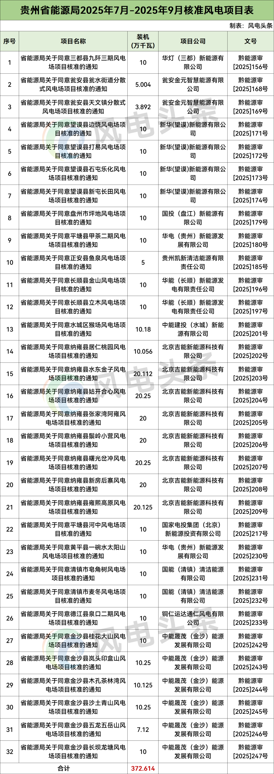 贵州2025年7月-2025年9月核准风电项目表如下: