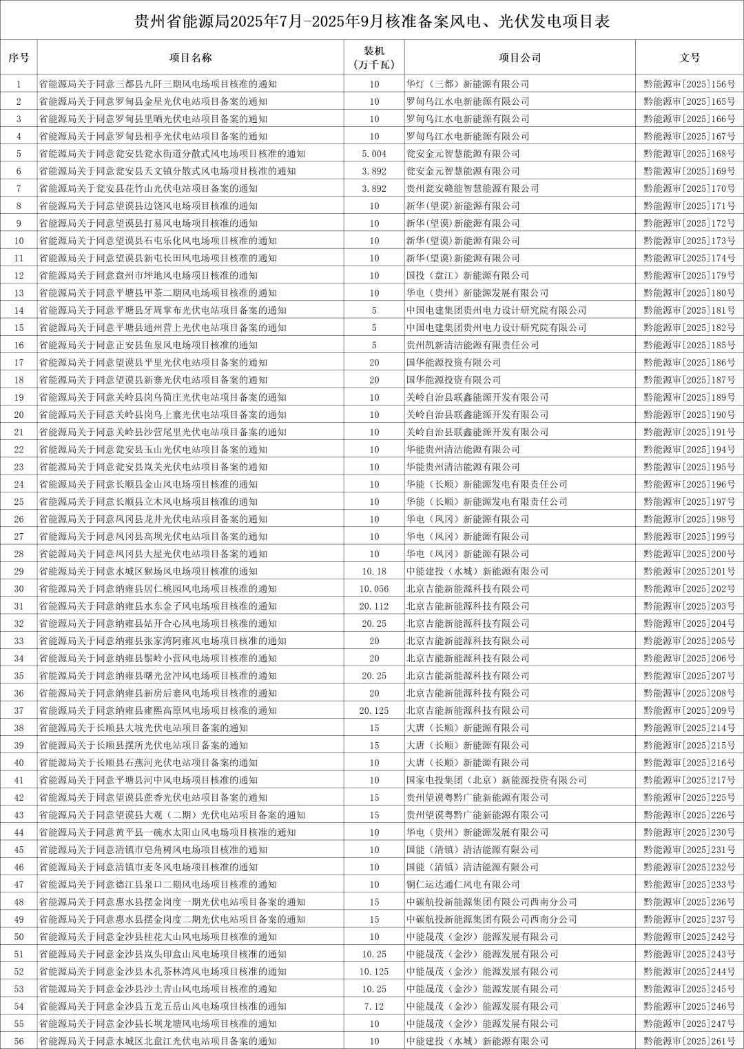 根据《省人民政府关于印发贵州省企业投资项目核准和备案管理办法的通知》(黔府发〔2018〕第7号),按照程序,贵州省能源局2025年7月-2025年9月核准备案风电、光伏发电项目56个,现将有关情况公布如下。