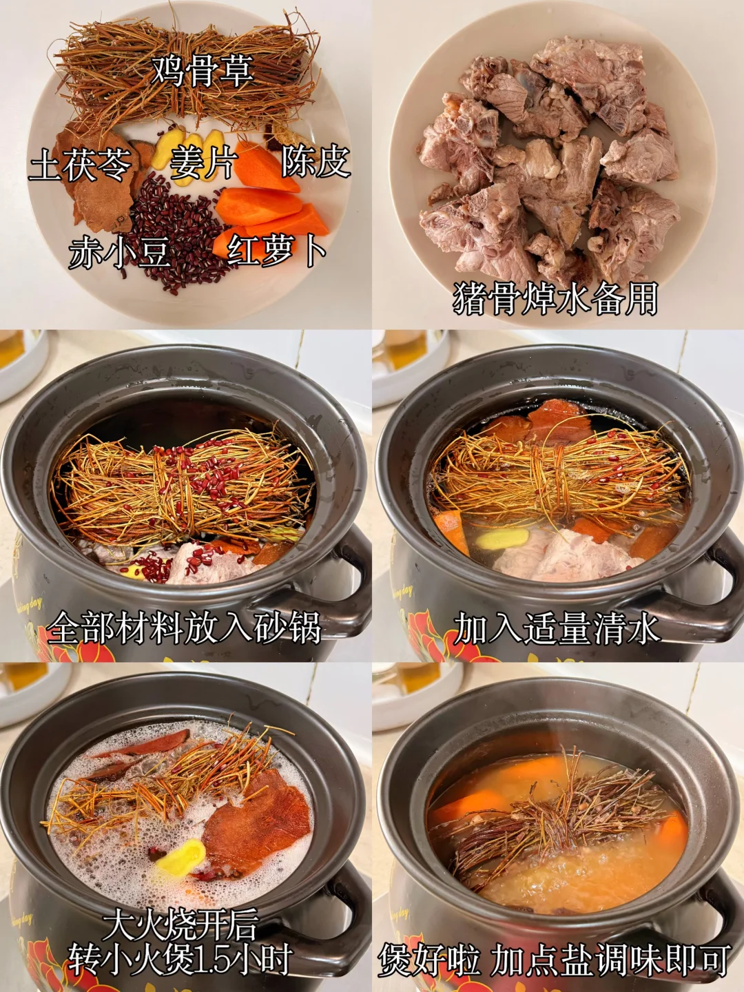鸡骨草土茯苓猪骨汤!祛肝🔥,口臭,疏肝解毒 国庆烧烤,煎炸,热气的东西不少吃,熬夜各种玩~ 热气到💥是时候清肠胃,降降火,调理一下[赞R] - 鸡骨草:清热利湿,散瘀止痛,疏肝护肝,它尤其擅长清除肝胆的湿热,对于因湿热引起的脘腹胀痛、熬夜、饮酒容易伤肝,鸡骨草有很好的保护肝脏的作用。 - 🍲食材: 鸡骨草、土茯苓、赤小豆、红萝卜、陈皮、姜片、猪骨 - [清单R]做法: [一R]鸡骨草和其他材料洗净、陈皮刮瓤、猪骨焯水 [二R]所有食材放入砂锅、加入适量清水 [三R]大火烧开转小火1.5小时即可、出锅加盐调味 - 经常熬夜加班,容易上火和疲劳的朋友可以试试 喝一碗鸡骨草汤清肝祛🔥,喝完整个人都神清气爽! ⚠️肾虚多尿,体质偏虚寒的朋友少喝~