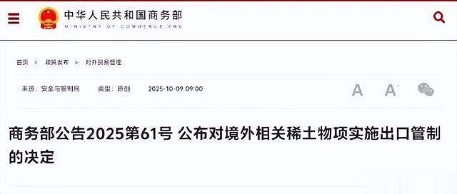 10月9日,商务部发布2025年第61号公告,对含有中国成分的部分境外稀土相关物项实施出口管制。
