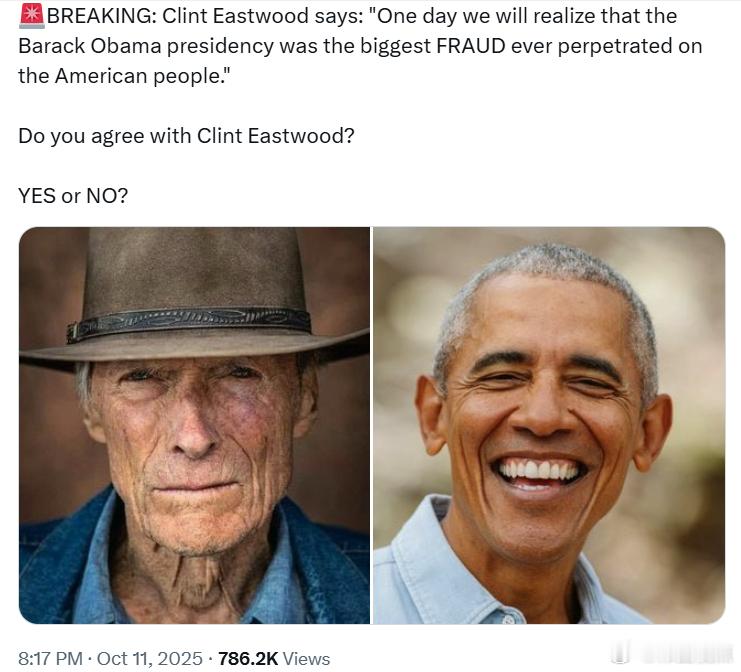 美国著名演员、导演和制片人克林特·伊斯特伍德说:“总有一天,我们会意识到,巴拉克·奥巴马的总统任期是对美国人民实施过的最大欺诈。”