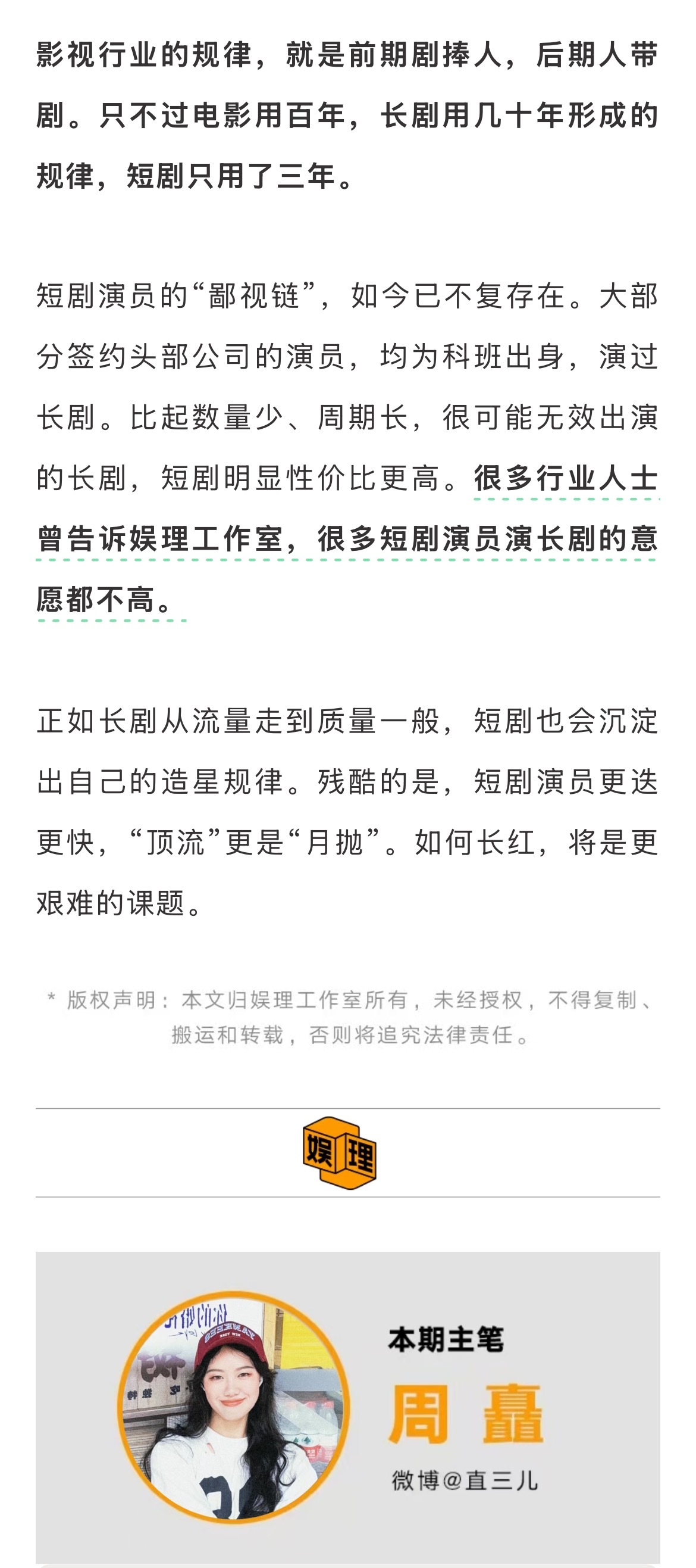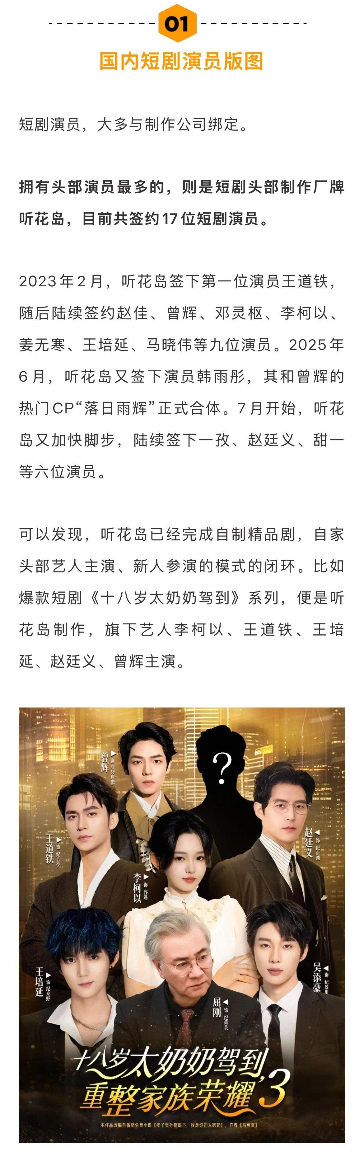 业内称短剧演员演长剧的意愿不高短剧男演员想和刘萧旭合作短剧演员大多与制作公司绑定。拥有头部演员最多的,则是短剧头部制作厂牌听花岛,目前共签约17位短剧演员。据新浪娱乐工作室了解,《好一个乖乖女》出品方于今无量于2025年初布局艺人业务,目前旗下有李沐汐、夏锦沐、胡荣涛、陈丹妮四位新人演员;《早逝白月光》系列出品方山海星辰已开始布局演员签约业务;10月10日,阅文短剧也发布公告招募短剧演员。