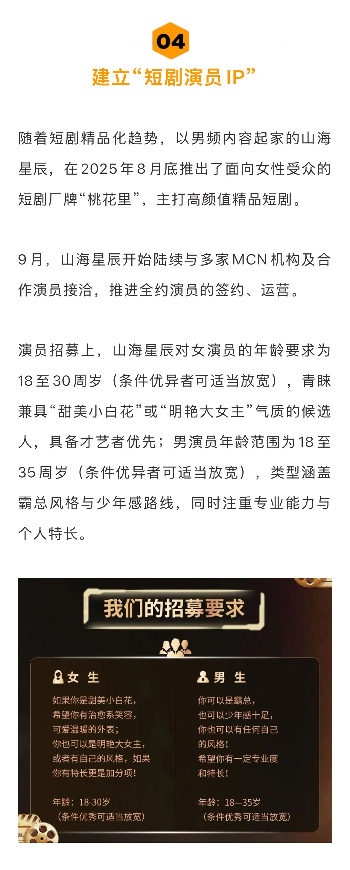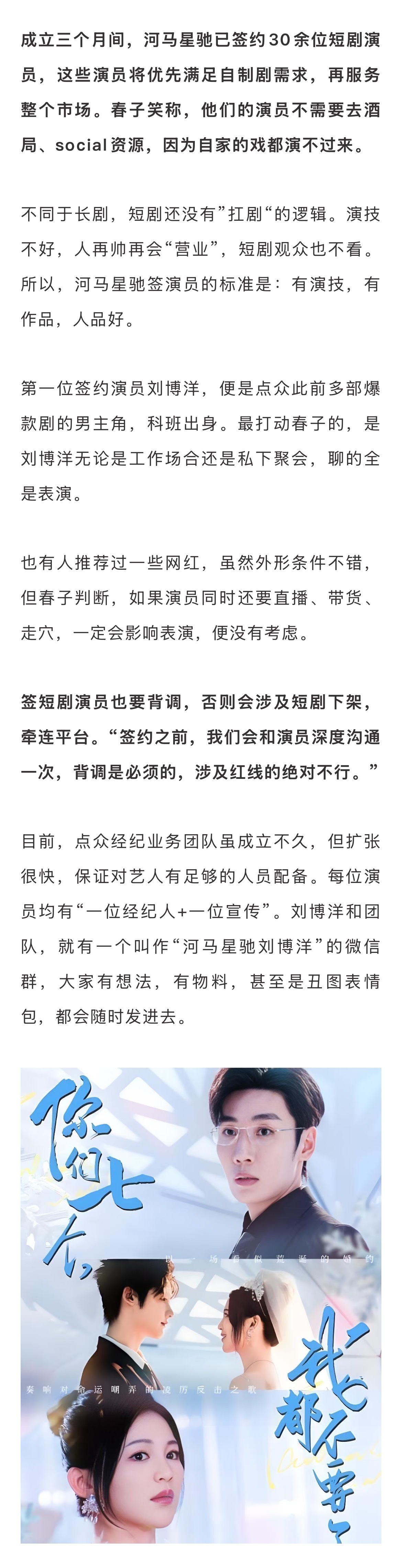此外,短剧平台也纷纷开启签人计划。点众则于7月成立经纪业务子公司河马星驰,目前已签约刘博洋等30余位演员。9月初,红果自制推出演员合作计划,演员入驻后可以享受作品分账,并由红果引入专业演员机构进行运营。