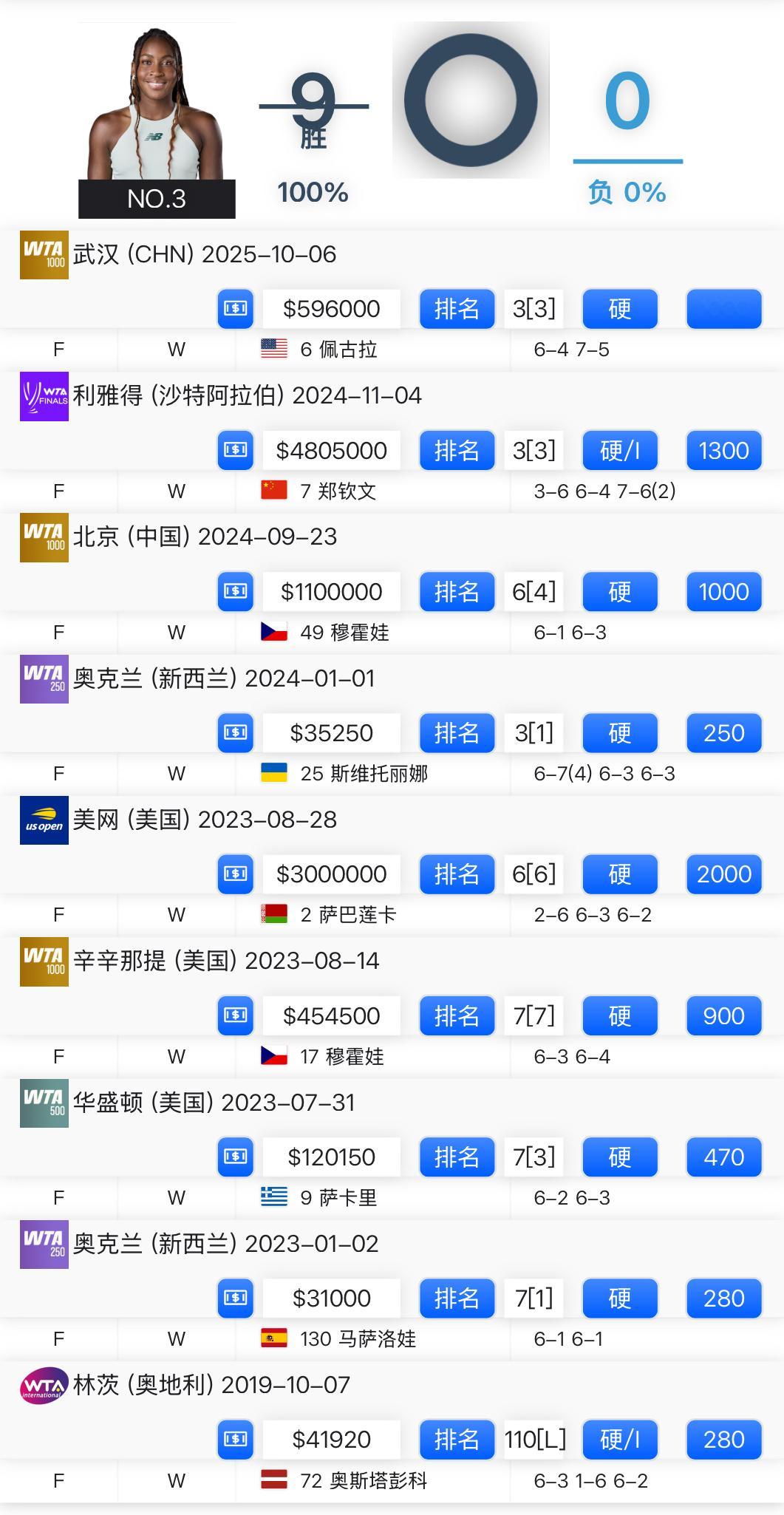 高芙硬地巡回赛决赛战绩刷新至完美的9胜0负,而且赢的人都绝非等闲之辈[震惊](请帮我想个头衔把马萨洛娃包进去[doge])