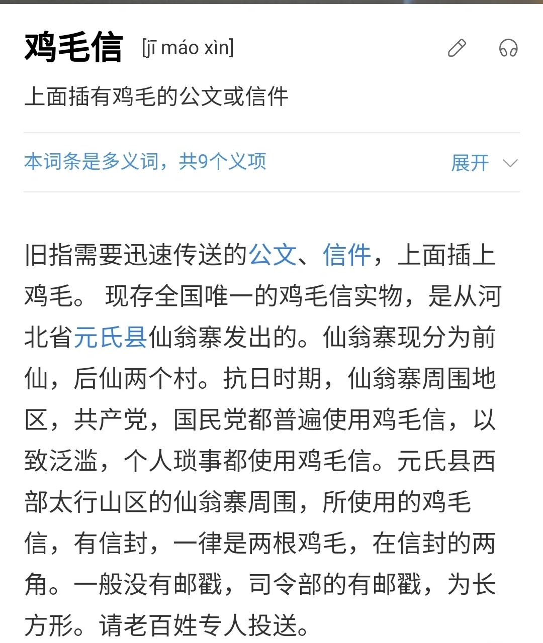 这信封上多出来的是羽毛!看到这里,“鸡毛信”三个字立刻跳了出来,可总有搭错时空的感觉! 🌈原来古时这种带羽毛的文书叫羽檄,是古代军事文书,插鸟羽以示紧急,须迅速传递。 🌈鸡毛信源于羽檄,其作用相似。 🌈古代车马很慢,慢到人们将重要的使命寄托在分量轻薄的“鸟羽”之上! 🌈到此,禁不住感叹一句:谢先人努力,我辈才能享受现代通信的发达便利!