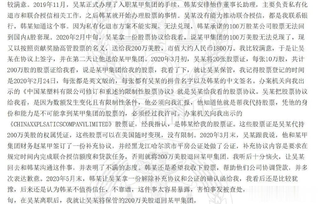 王某供述,2019年八九月份,韩某到我办公室找我,跟我提及某公司准备退出美股回到国内A股上市,可以提前购买100万股,如果回国内A股上市可以增值,但只有某甲集团的顾问、高管等才可以有资格购买。韩某跟我说找别人代持,没说让我出钱的事。同时将一份装有100万股票材料的纸袋交给我,我没拒绝,把材料收下了。2019年国庆节后,吴某来看我,吴某在上市公司工作过,了解股票情况,我比较信任吴某,就想让吴某去某甲集团担任顾问、高管或者财务总监,帮我代持股票。2019年11月,吴某正式办理了入职某甲集团的手续。因为私有化退市方案不能实现,无法兑现,韩某承诺的100万股某公司股票无法回到国内A股套现。2020年2月中旬,吴某拿一份股票协议给我看,说某甲集团的100万美股无法兑现了,现又以按照贡献奖励高管股票的名义,送给我200万美股,市值大约人民币1800万。我比较满意,于是让吴某在协议上签字,并在第二天让他送给某甲集团。2020年3月初,吴某将20张股票证,每张10万股,共计200万股的股票证给我看,说是某甲集团给我的股票,我看了下,就让吴某保管。2020年3月末,吴某跟我说,他和某甲集团财务赵某甲签订了一份补充协议,并经黑龙江哈尔滨市平房公证处做了公证,补充协议内容是要求在规定时间内完成联合授信额度和贷款任务,否则就将200万美股退回某甲集团。我听后十分恼火,让吴某回去和韩某沟通这件事,并表明了不满的态度。韩某还是希望我收下股票,帮助他们公司协调贷款,并多次表达歉意。2020年5月末,韩某让吴某拿一份解除补充协议和公证的确认函给我,我看后还是比较犹豫,后来还是认为韩某不值得信任,不靠谱,这件事太容易暴露,害怕事发被查处,于是2020年6月中旬,在吴某离职后,我就让吴某将保管的200万美股退回某甲集团。