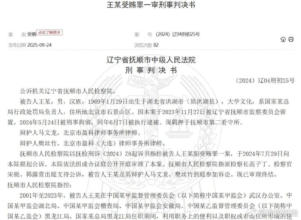 2025年9月24日,中国裁判文书网刊登的《王某受贿罪一审刑事判决书》[案号:(2024)辽04刑初25号]披露,国家金融监督管理总局行政处罚局原负责人王柱落马过程。