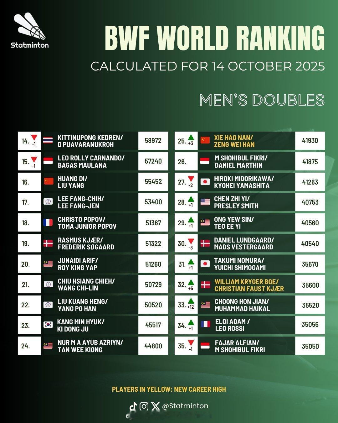 男双排名整体变化不大,梁王组合上升一名来到第4️⃣,浩瀚组合创组合新高排名来到第25位!