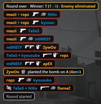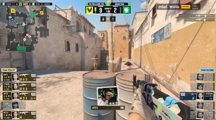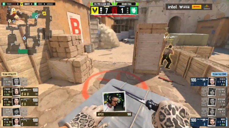 第8局猎鹰纯E,Niko冲出A1看B1背身沙鹰三发全空被ropz反杀,apex狂轰三杀,小蜜蜂7-1猎鹰。