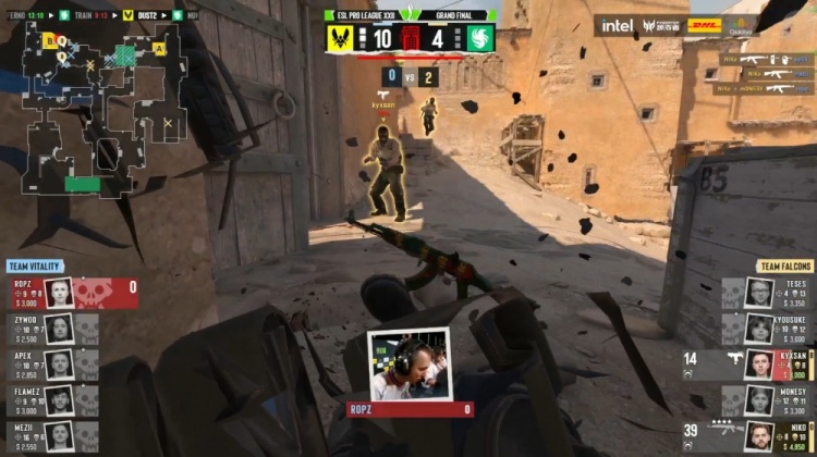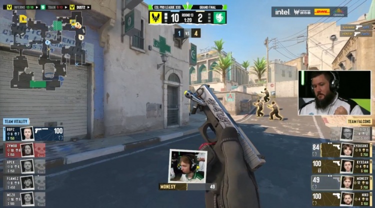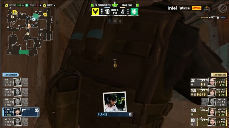 第14局小蜜蜂强起,猎鹰四人带包转中路,Monesy佯攻A大被杀,猎鹰四人走中门,Niko击杀Zywoo,CT封烟,京介穿掉火仔,Niko在B下包,猎鹰二打三,Niko狗洞击杀apex再杀mezii再杀ropz,单局轰出四杀,小蜜蜂10-4猎鹰。