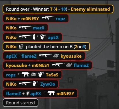 第10局中路Monesy与京介联手击杀Zywoo与火仔,小蜜蜂三人随后带包上A小,猎鹰三人看A,龙哥换掉apex,mezii独自上A平台下包被Niko击杀,小蜜蜂8-2猎鹰。