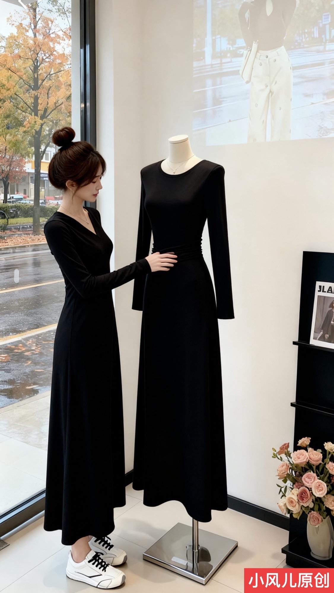 百搭老钱风黑色连衣裙。在专柜内写生,神态愉悦松弛,黑色长袖连衣裙简约修...