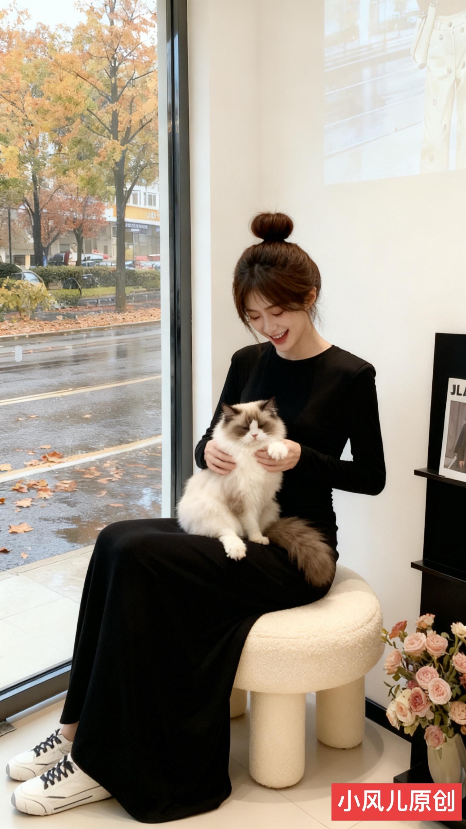 抱猫而坐,笑容明媚温柔,同款黑裙搭小白鞋,休闲中透精致。