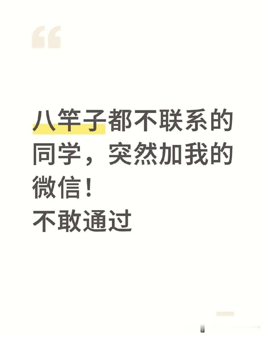 十年不联系的同学,突然加我的微信!不敢通过 那个毕业十年,名字都快想不起来的同学,突然申请加你微信了!是不是瞬间头皮发麻,脑子里闪过“借钱”“卖保险”“拉传销”三连击? 网友集体炸锅:“这种八竿子打不着的同学,加我我就当是诈骗预警!” 有人说自己通过后被拉进杀猪盘群,有人被硬推销三无产品,简直是“社交惊吓”现场! 可反过来想,万一人家真是单纯想叙旧呢?但在这满是套路的社交江湖里,你是选择“社恐式拒绝”保平安,还是赌一把“万一有好事”?要是你,敢通过吗?