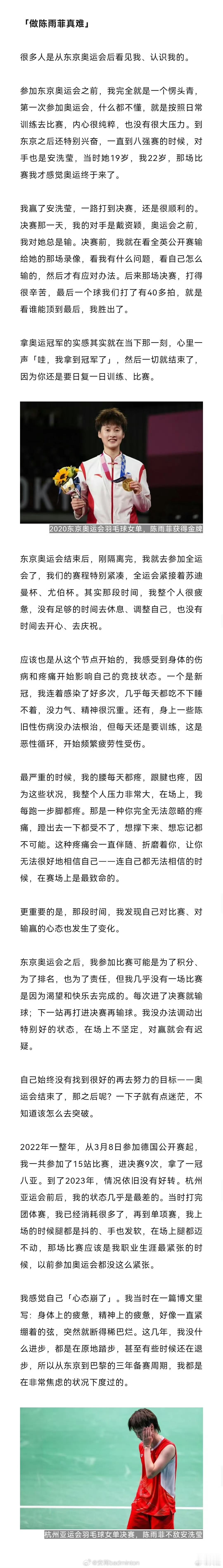 陈雨菲说:去年巴黎奥运会后,我很久都没有登录过社交媒体。第一次打开是在几个月后的墨尔本,我很意外地发现有一条长信息,是戴资颖发给我的。她说她无法想象我承受了多大的压力和期望,希望我能卸下重担,一切都好。她也说不管我未来的决定是什么,是否会回到赛场都祝福我快乐,健康。我没想过,曾经我最大的对手,最难缠的对手会给我发来这样信息,我也真的开始明白她对我的意义。如果说,有一个人成就了我,让我变成今天的陈雨菲,那一定是戴资颖。